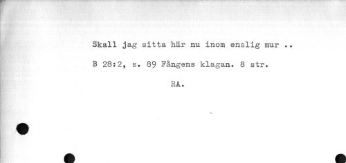 //// Skall jag sitta här nu inom enslig mur .. B 28:2, s. 89 Fångens klagan. 8 str. //// rå. ////