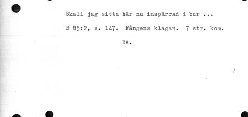 //// •i //// 1 //// Skall jag sitta här nu inspärrad i bur ... B 8552, s. 147. Fångens klagan. 7 str. kom. //// RA. //// K ' f //// » ////