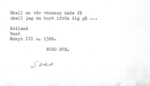 //// Skall nu vår vänskap ände få skall jag nu bort ifrån dig gå ... //// Estland Runö //// Mskpt III s? 1388. //// NORD MUS* //// • ' $S5 ': ¦ 1 ¦ ¦ kil''.' ?Vr«. , ¦ ////