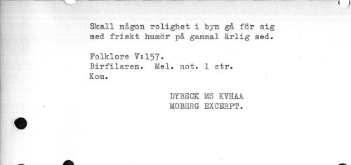//// Skall någon rolighet i byn gå för sig med friskt humör på gammal ärlig sed. //// Folklore T:157. //// Birfilaren. Mel. not. 1 str. //// Kom. //// DYBECK MS KVHAA MOBERG EXCERPT. ////