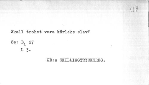 //// /j? //// Skall trohet vara kärleks slav? //// Se,Bl27 L 3. //// t //// KB:s SKILLINGTRYCKSREG. I //// i //// i //// i //// i ! ////