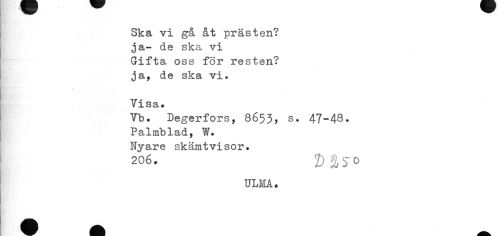 //// Ska vi gå åt prästen? ja- de ska vi Gifta oss för resten? ja, de ska vi. //// Visa. //// Vt). Degerfors, 8653, s. 47-48. Palmblad, W. Nyare skämtvisor. //// 206. t)%SO //// ULM. ////