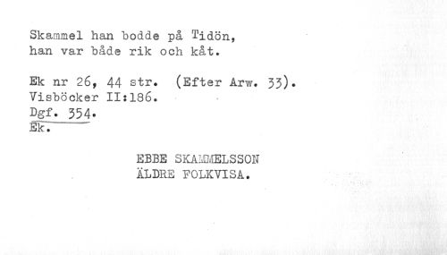 //// Skammel han bodde på Tidon, han var både rik och kåt. //// Ek nr 26, 44 str. (Efter Arw. 33). //// Visböcker 11:186. //// Dgf. 354- //// Ekl //// EBBE SKAMMELSSON ÄLDRE FOLKVISA. //// ¦ ¦• ¦5 ////