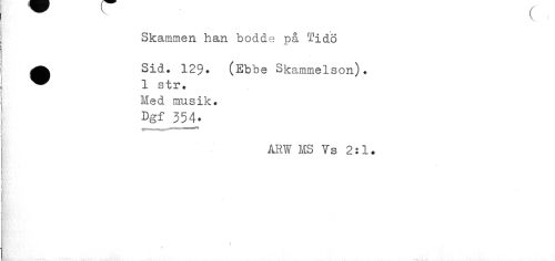 //// ^ v V //// Skammen han bodde på Tidö //// •Sid. 129. (Ebb e Skammelson). 1 str. Med musik. //// Dgf 354. //// ARW MS Vs 2:1. //// 1 ////