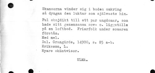 //// ^^ Skansorna vänder sig i boden omkring //// så dyngan den luktar som självaste hin. //// Ful skojdikt till ett par ungdomar, som hade sitt gemensamma sov- o. liggställe på en loftbod. Friarfolk under somaren förstås. Med mel. //// Dal. Grangärde, 14900, s. 85 a-b. Eriksson, L. Nyare skämtvisor. //// ULM. ////