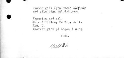 //// Skatan gick uppå ängen och|slog med alla sina små drängar. //// ^^ Vaggvisa med mel. //// Dal. Alfdalen, 2497:s. 1. Åhs, L. //// Ekorren gick på ängen å slog. //// TJLMå. //// /VnétU ////