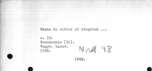 //// - //// . //// Skata ho sitter på stugutak ... s. 29 * //// Gunnarsnäs (Dl). //// Vaggv. barnv. *y 1|> //// 5298. la //// IFGH. ////
