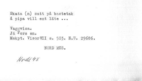 //// Skata (n) satt på bastetak å pipa vill ent läte ... //// Vaggvisa. Jä i?ors sn. //// Mskpt. VisorVEI s. 503. E.U. 29686. //// NORD MUS. ////