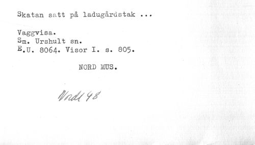 //// Skatan satt på ladugårdstak ... //// Vaggvisa. Sm. Urshult sn. //// 8064* Visor I. s. 8O5. //// nord ms. //// / ////