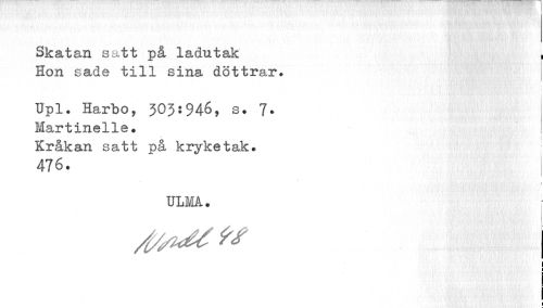 //// Skatan satt på ladutak , //// Hon sade till sina döttrar. //// Upl. Harbo, 303:946, s. 7. //// Martinelle. //// Kråkan satt på kryketak. //// 476. //// ! //// ULMA. //// /(y/uéttf //// I 1 //// 1 ¦ //// i ////