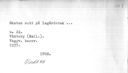 //// b //// j //// I //// i //// Skatan satt på lagårdstak //// s. 24. Våxtorp //// (Hall.)» //// Vaggv. barnv. | //// 2237- //// IFGH. //// i ¦ //// : //// t ////