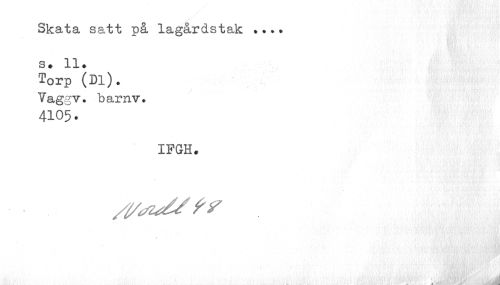 //// Skata satt på lagårdstak ?..? //// S» 11. //// Torp (Dl). //// Vag;v. b arnv. //// 4105. //// IFGH. //// /l/sz^ fr //// ; ////