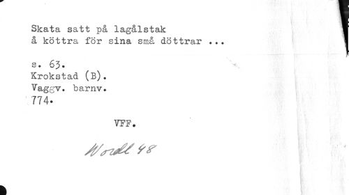 //// v //// Skata satt på lagålstak W //// å köttra för sina små döttrar 1 //// s. 63. //// Krokstad (B)# //// Vaggv. barnv* //// ' 774- //// YFF. //// k ! ////