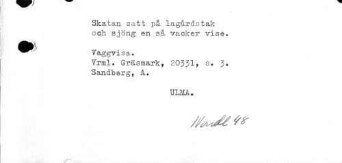 //// Skatan satt på lagårdstak och sjöng en så vacker vise» //// Vrml. Gräsmark, 20331, s» 3* Sandberg, A. //// ULMA. //// /jfa/ttr ////
