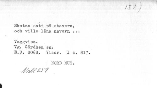 //// /s / J //// I //// i //// vt ^ ! //// Skatan satt på stavern, | //// och ville låna nävern **• //// » //// Vaggvisa* //// "Vg. Gårdhem sn. //// B.U. 8068. Visor* I s. 817* //// nord ms. //// i ////
