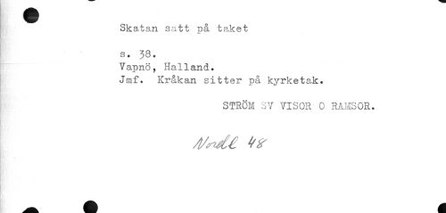 //// Skatan satt på taket s. 38. //// Vapnö, Halland. //// Jmf. Kråkan sitter på kyrketak. //// STRÖM 3 V VISOR 0 RAMSOR. //// /l/<«d£ k sr ////