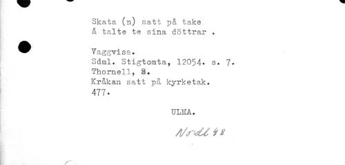//// Skata (n) satt på take å talte te sina döttrar . //// Vaggvisa. //// Sdral. Stigtomta, 12054* s. 7* //// Thornell, §. //// Kråkan satt på kyrketak. //// 477- //// ULMÅ. //// « //// A ////