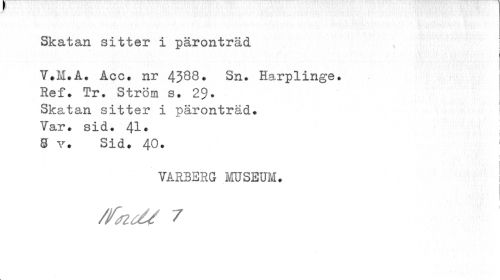 //// Skatan sitter i päronträd //// V.M.A. Acc. nr 4388» Sn. Harplinge. //// Ref. Tr. Ström s. 29« //// Skatan sitter i päronträd. Var. sid. 41* //// S v. Sid. 40. ; //// f //// VARBERG MUSEUM. ////
