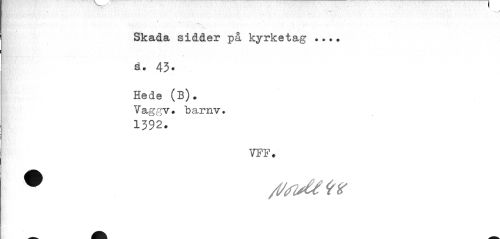 //// ___* //// v " " //// Skada sidder på kyrketag ... //// ä. 43. //// Hede (B). Vaggv. barnv. 1392. //// VPF. ////