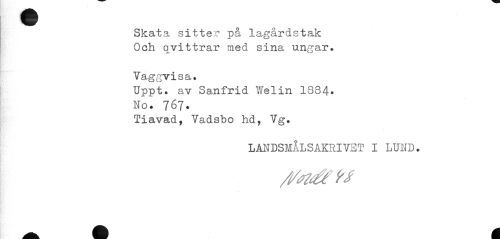 //// Skata sitter på lagårdstak Och qvittrar med sina ungar. //// Vaggvisa. //// Uppt. av Sanfrid Welin 1834. //// No. 767. //// Tiavad, Vadsbo hd, Vg. //// LANDSMÅLSAKRIVST I lund. ////