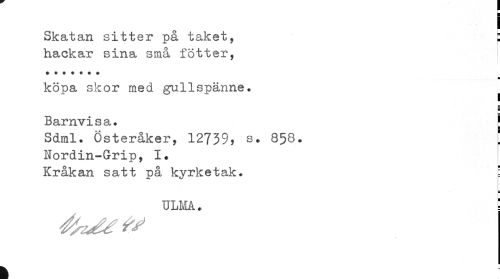 //// I //// Skatan sitter på taket, : //// hackar sina små fötter, //// ¦ //// köpa skor med gullspänne. //// Barnvisa. [ //// Sdml. Österåker, 12739, s. 858. //// Nordin-Grip, I. //// Kråkan satt på kyrketak. ' //// ¦ //// ULMÅ. ! //// \ ////