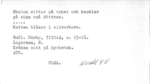//// Skatan sitter på taket och kacklar //// på sina små döttrar. //// Katten blåser i silverhorn. //// Smal. Näsby, 7132:4, s. 15-16. Lagerman, E* //// Kråkan satt på kyrketak. //// 473. //// ULM. ////