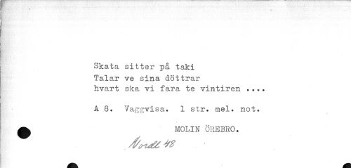 //// Skata sitter på taki //// Talar ve sina döttrar hvart ska vi fara te vintiren //// Å 8. Vaggvisa. 1 str. mel. not. //// A MOLIN ÖREBRO. //// t ////