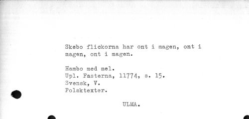 //// Skebo flickorna har ont i magen, ont i magen, ont i magen. //// Hambo med mel. //// Upl. Fasterna, 11774» s. 15* //// Svensk, V. ^^^ Polsktexter. //// ULM ? ////