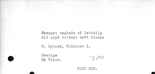 //// Skeppet seglade så lettelig Alt uppå vattnet dett blanka //// » //// R. Dybeck, Folklore I. //// • SÄ. m //// NORD MUS. ////