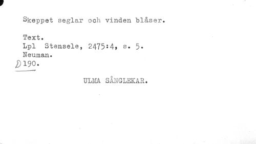 //// Skeppet seglar och vinden blåser. Text. //// Lpl Stensele, 2475*4, s* 5* //// Neuman. //// i) 190. //// ULMA. SÅIGLEKÅR. //// % ////