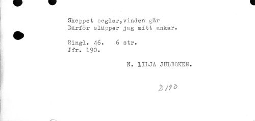 //// Skeppet seglar,vinden går Därför släpper jag mitt ankar» //// Ringl. 46. 6 str. Jfr» 190» //// N. 1ILJA JULBOKEN. //// 2>nt> ////