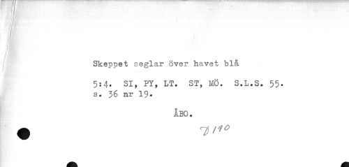 //// I f //// 'JMraSr ' i //// '/vB^v //// Skeppet seglar över havet blå //// 5:4. SI, PY, LT. ST, MÖ. S.L.S. 55. //// s. 36 nr 19. //// ÅBO. ////