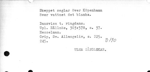 //// Skeppet seglar över Köpenhamn över vattnet det blanka. //// Dansvisa t. ringdans. //// Upl. Hållnäs, 303:578, s. 37- //// Hesselman. //// Grip, Sv. Allmogeliv, s. 225* //// 245". V Ho //// ULMA SÅNGLEKAR. ////