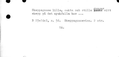 //// jP*U 11 °*3 X* //// Skeppsgosse lilla, sakta och stilla ;pari£x sitt ^^ skepp på det nyckfulla hav ... //// B 23-24:2, s. 56. Skeppsgossevisa. 2 str. //// RA. ////