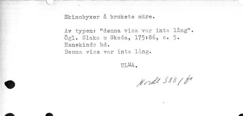 //// « ¦.._. //// Skinnbyxer å brokete märe. //// Av typen: "denna visa var inte lång". Ögl. SIaka o Skeda, 175-86, s. 5. Hanekinds hd» Denna visa var inte lång. //// ULMA. ////