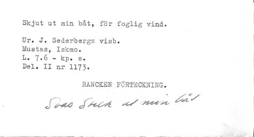 //// I //// I //// Skjut ut min båt, för foglig vind. //// Ur. J. Sederbergs visb. Mustas, Iskmo. L. 7•6 - kp. s. Del. II nr 1173. //// RANCKEN FÖRTECKNING» ////