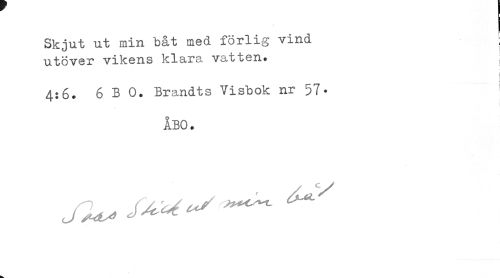 //// Skjut ut min båt med förlig vind utöver vikens klara vatten. //// i //// { //// 4:6. 6 B O. Brandts Visbok nr 57. ; //// ÅBO. //// y V ////