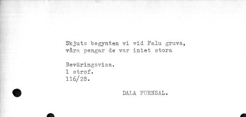 //// « //// Skjuts begynten vi vid Falu gruva, våra pengar de var intet stora //// Beväringsvisa. 1 strof. 116/28. //// 9 DALA FORNSAL. ////