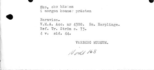 //// Sko, sko hästen i morgon kommer prästen //// ^^^ Barnvisa* //// V.M.A. Acc. nr 4338. Sn. Ilarplinge. //// Ref. Tr. Ström s. 73. 4 v. sid. 44» //// VÅRBERG MUSEUM. ////