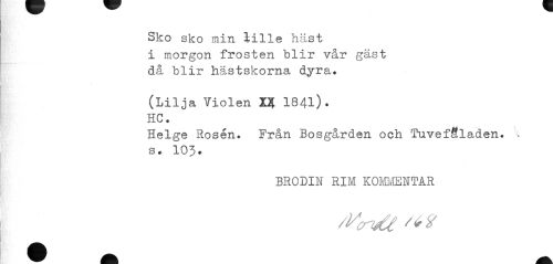 //// Sko sko min lille häst i morgon frosten blir vår gäst då blir hästskorna dyra» //// (Lilja Violen 1% 184l). HC. //// Helge Rosén. Från Bosgården och TuvefSladen. ;v s» 103» //// BRODIN RIM KOMMENTAR ////