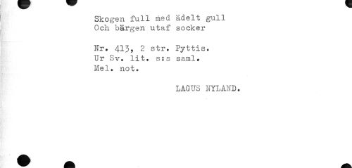 //// Skogen full med ädelt gull Och bärgen utaf socker //// Nr, 413, 2 str. Pyttis. Ur Sv, lit. s:s saml* Mel, not. //// LAGUS NYLAND* ////