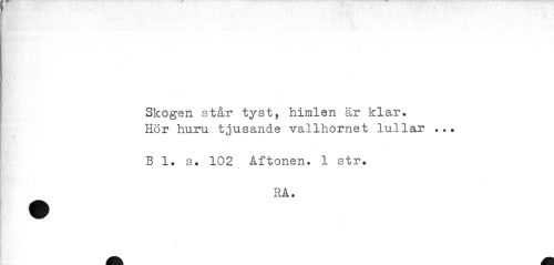 //// Skogen står tyst, himlen är klar. Hör huru tjusande vallhornet lullar ... //// B 1. s. 102 Aftonen. 1 str. //// ra. //// - ////