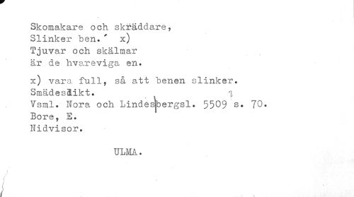 //// Skomakare och skräddare, Slinker ben.' x) Tjuvar och skälmar är de hvareviga en. //// x) vara full, så att benen slinker. SmädesäLikt. % //// Vsml. Nora och Lindésjbergsl. 5509 s. 70. Bore, E. Nidvisor. //// ULM. //// i //// / \ //// i //// » ////