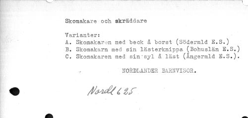 //// Skomakare och skräddare Yarianter: //// A. Skomakaren med beck å borst (Södermld E.S.) //// B. Skomakarn med sin lästerknippa (Bohuslän E.S.) //// C. Skomakaren med sin'syl å läst (Ångermld E.S.). //// NORDLANDER BARNVISOR. //// * ////