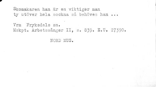 //// Skomakaren han är en viktiger man ty utöver hela sockna så' "behöves han ... //// i I //// Vrm Fryksdals sn. //// Mskpt. Arbetssånger II, s. 339* E.U. 27390. //// NORD MUS. //// | ////