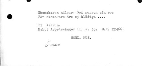 //// Skomakaren hälsar: God morron min ros För skomakare äro ej blödiga ... //// Bl Asarum. //// Mskpt Arbetssånger II, s. 35. E.U. 22466. //// NORD. MUS. //// / //// hfflHwffiWi 't&tffcXii . y.ti. .- «• • I , . Mméuu. ////