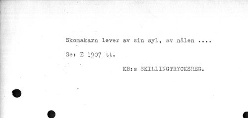 //// % //// ... //// Skomakarn lever av sin syl, av nålen ... Se: E 1907 tt. //// - //// KBjs SKILLINGTRYCKSREG. //// * ////