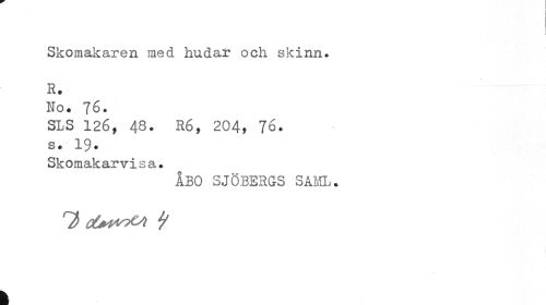 //// i //// Skomakaren med hudar och skinn. //// R. //// No. 76. //// SLS 126, 48. R6, 204, 76. //// s. 19. //// Skomakarvisa. //// ÅBO SJÖBERGS SAML. //// 1) Ct+KISXA ty //// V ////