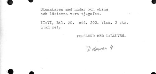 //// Skomakaren med hudar och skinn och lästerna voro tjugofem. //// II:VI, Bil. 20. sid. 202. Visa. 2 str. utan mel. //// FORSLUND MED DALÄLVEN. //// ot^MM 1 //// \ //// ^m a ////