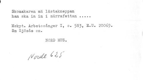 //// Skomakaren mä lästakneppan //// han ska in in i märrafettan ... //// Mskpt. Arbetssånger I, s. 583, E.U. 20069. Sm Sjösås sn. //// NOHD MUS» //// /!/<rvU tlS' ////
